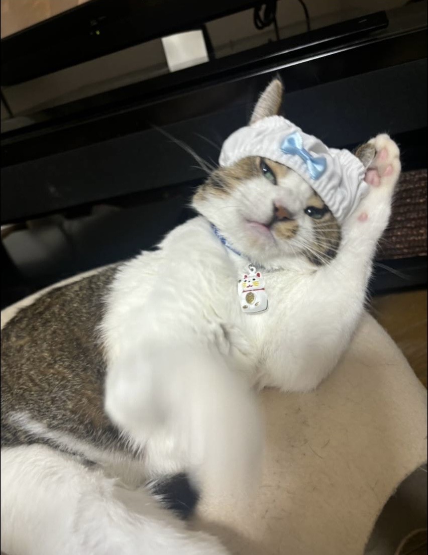 ・それにもめげず、ペンダントチャームと同じ招き猫のポーズしてみました‼️(イヤ、本当は、この変なもの取って欲しい〜ッポーズでした)