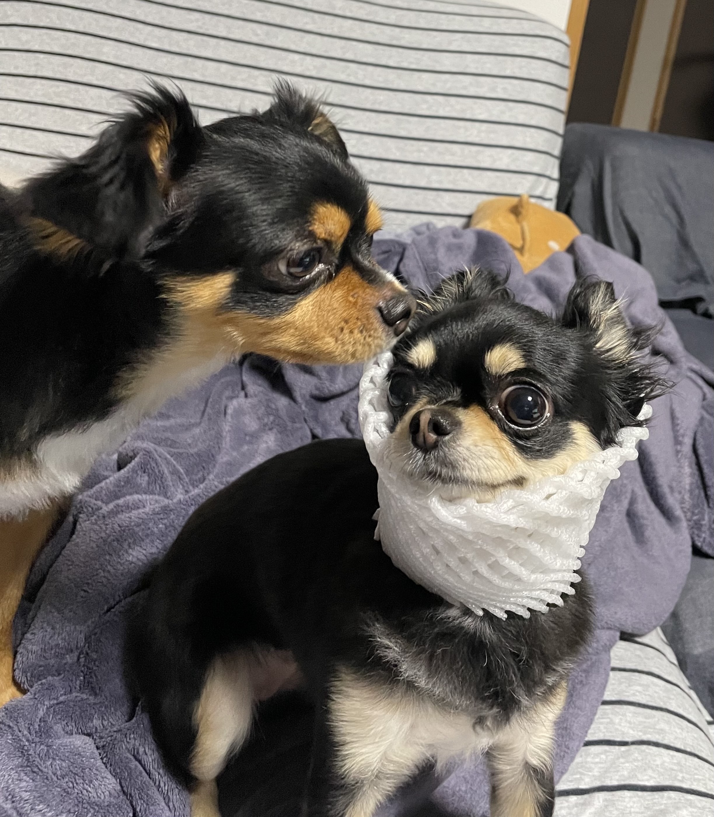 ・ラテちゃん、ムチウチなの?と心配そうなココア。いえいえ、オシャレなネックウォーマーなんです。