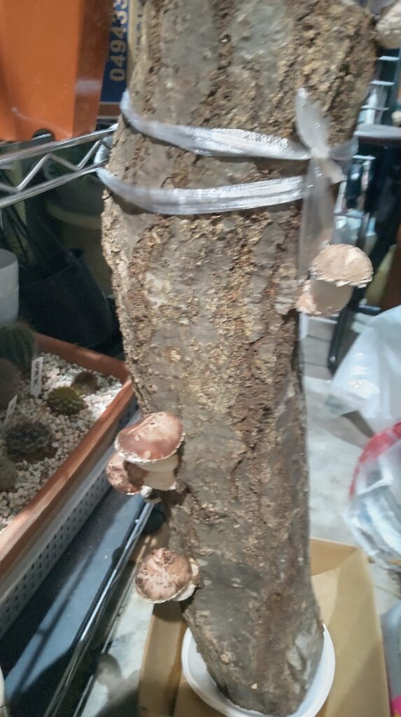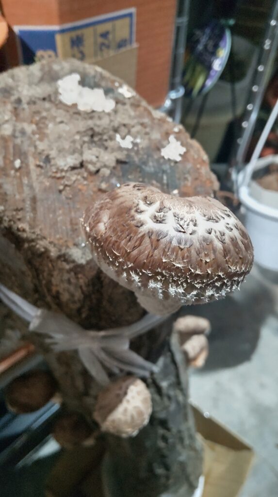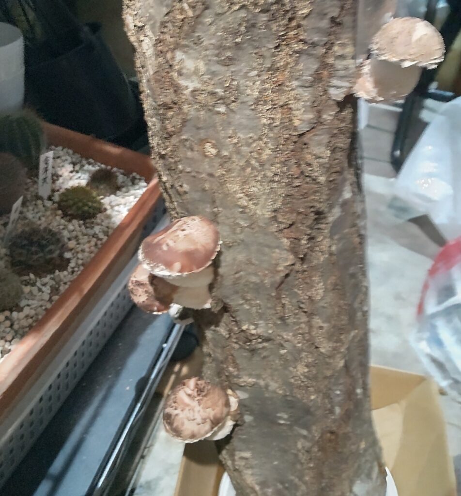 当社、植物博士のSさんの自宅物置で、原木栽培の椎茸が顔を出しました。